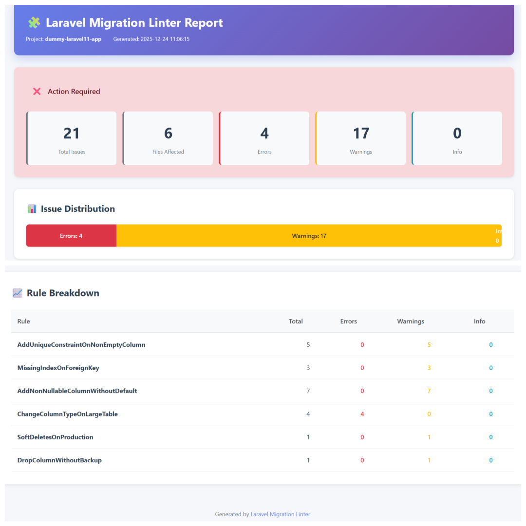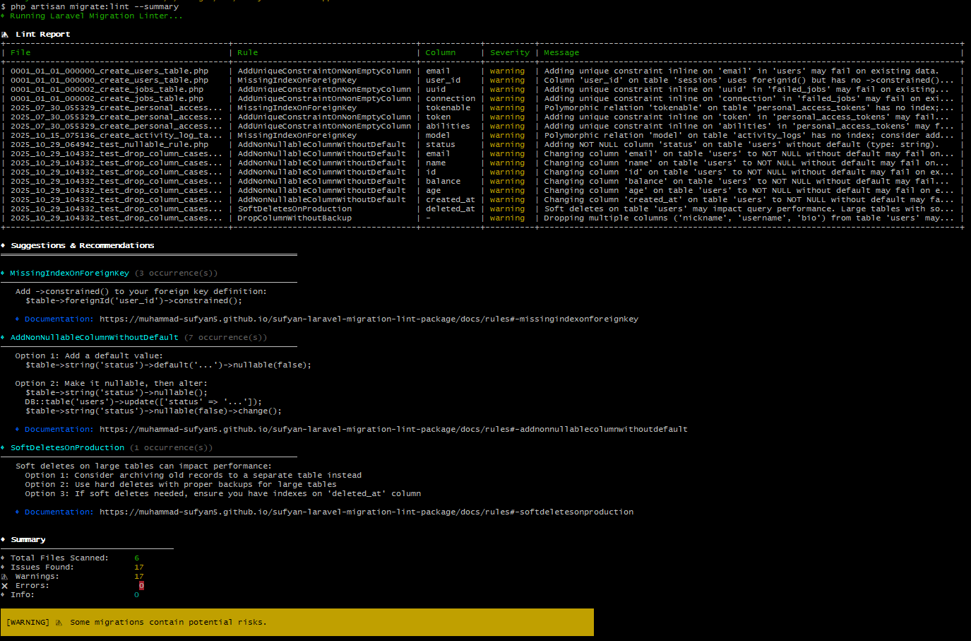 Laravel Migration Linter is a lightweight developer tool that automatically scans your database migrations for risky schema changes before they hit production.